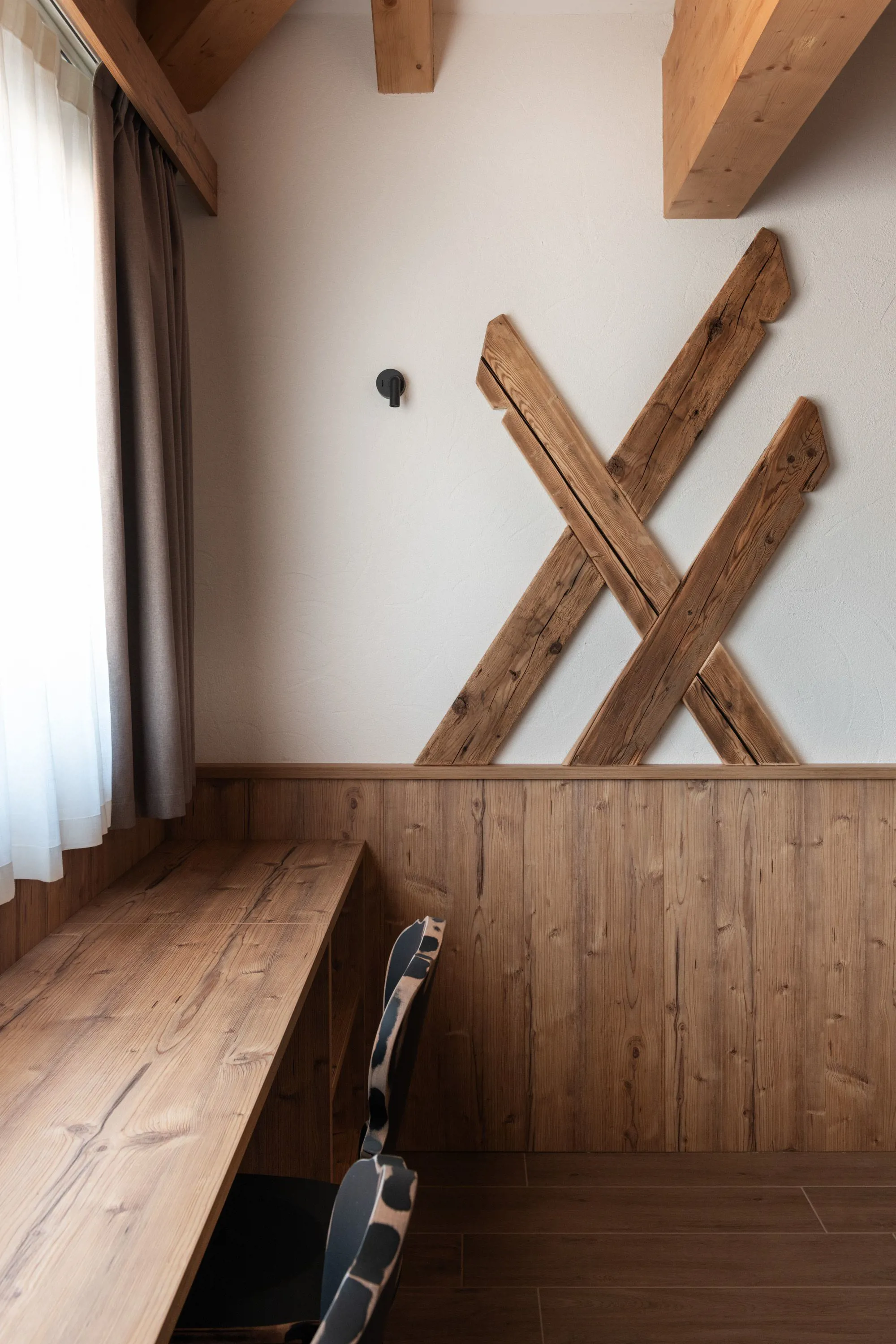 Calda atmosfera creata con arredi essenziali in laminato effetto legno, che evocano la rustica eleganza delle tradizioni montane. Dettagli che richiamano a elementi costruttivi tipici della tradizione Montana.